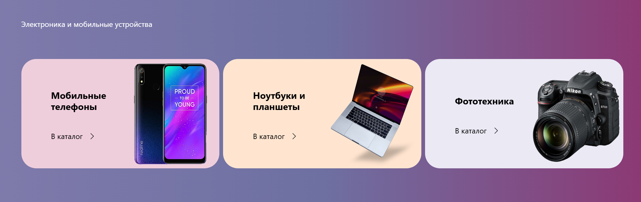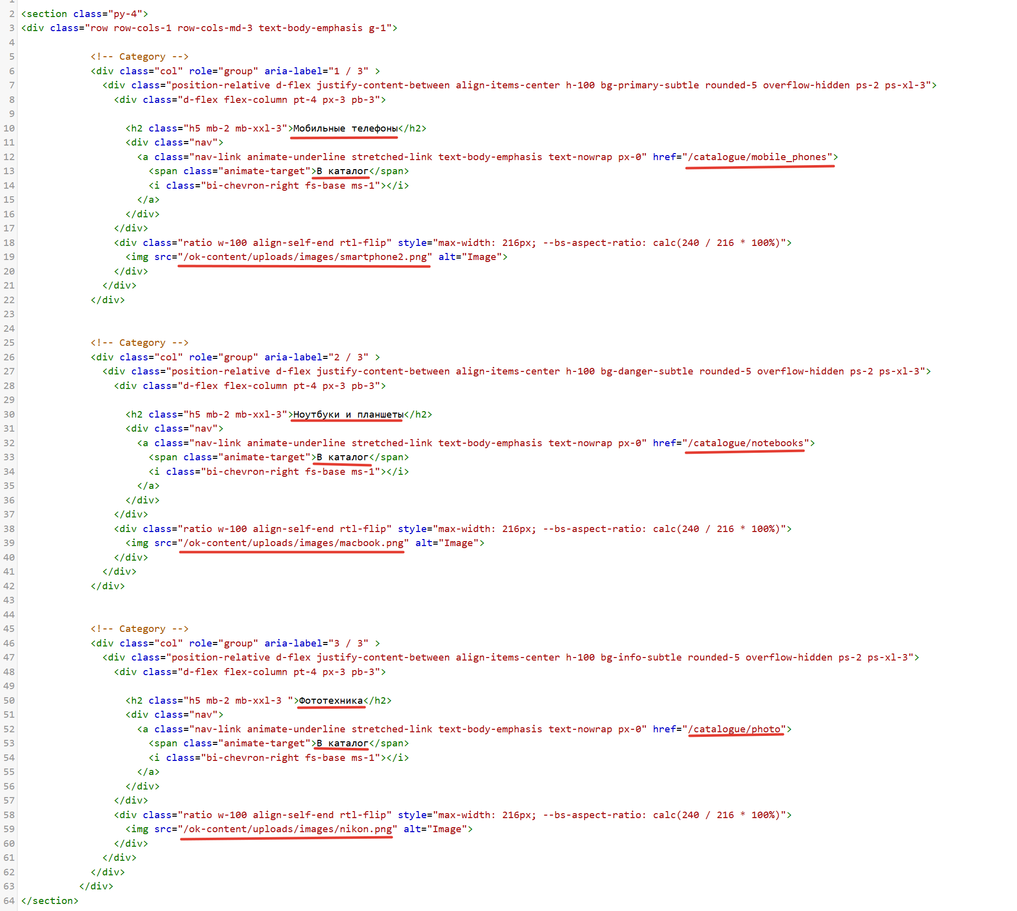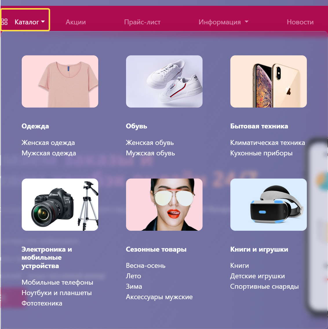 В поле "Верхнее описание" можно создать красивые ссылки, рекламные баннеры со списком ваших подразделов. В примере карточки с названием категории, ссылкой для перехода "в каталог" и изображением. Верстка адаптируется для всех размеров экранов.