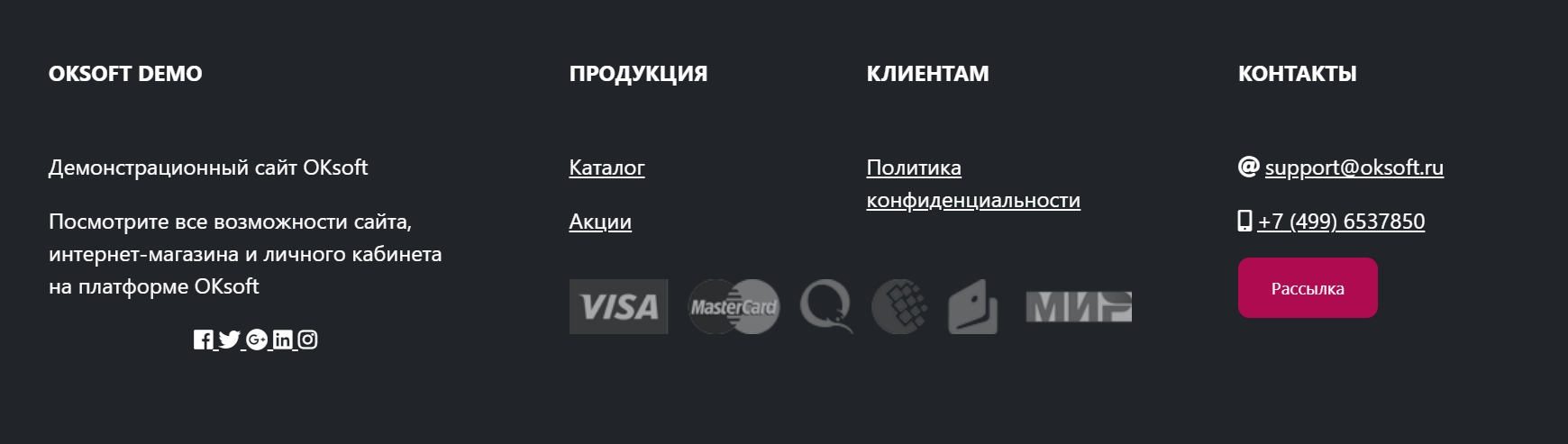 Футер (или "подвал сайта") - нижняя часть сайта, которая есть на всех страницах. Здесь принято размещать контактную информацию, техническую информацию, ссылки на правила обработки персональных данных, документацию, ссылки на официальные соцсети компании, контакты компании, логотипы и другую информацию.